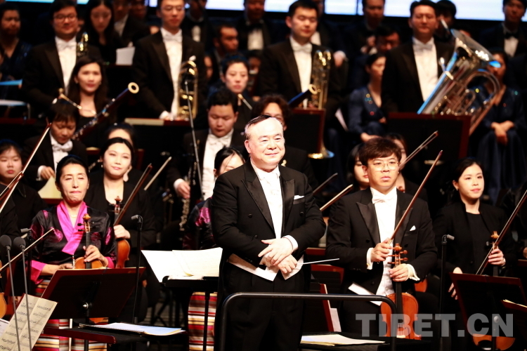 本場音樂會由中國文聯(lián)副主席、書記處書記,中央音樂學院院長,著名指揮家俞峰擔任指揮,中央音樂學院交響樂團與西藏自治區(qū)歌舞團愛樂樂團聯(lián)合伴奏。圖為本場音樂會指揮俞峰(前排中) 攝影:劉莉