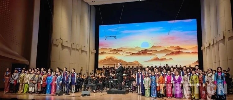 圖為北京海淀區(qū)民族小學陽光合唱團和西藏珠峰少年合唱團童聲合唱《雪山連北京》(西藏文聯(lián)供圖)