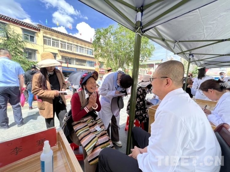 “從首都老遠(yuǎn)跑來給我們看病送藥,嘎真切(感謝)、故次仁(愿您長(zhǎng)壽)?!毕虬颓谠诠强屏x診點(diǎn)給來自北京海淀區(qū)花園路社區(qū)衛(wèi)生服務(wù)中心主任李寒看完膝蓋、胳膊、肩膀等關(guān)節(jié)病后一會(huì)兒雙手合十、一會(huì)兒舉起大拇指、一會(huì)兒又跟李醫(yī)生握手表達(dá)著心中的感謝之情。