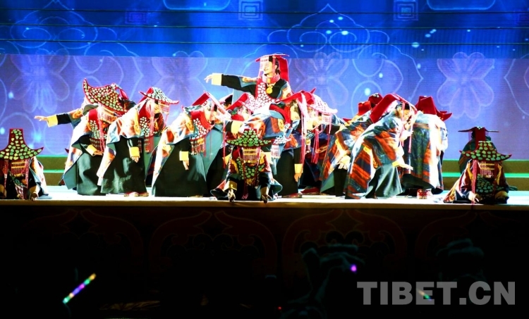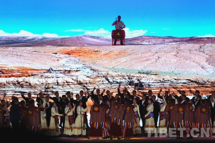 隨后盛大的開幕式文藝演出如期而至。演出共分為《悠遠(yuǎn)古韻》《詩(shī)意微芒》《如炬經(jīng)典》《輝煌盛世》四個(gè)篇章?!队七h(yuǎn)古韻》篇章為大型情景表演,結(jié)合古格壁畫為開場(chǎng)表演,展現(xiàn)出阿里人民群眾的精神面貌和獨(dú)特的阿里神韻?!对?shī)意微芒》匯集阿里地區(qū)諸多極具代表性的國(guó)家級(jí)非物質(zhì)文化遺產(chǎn)節(jié)目,展現(xiàn)阿里地區(qū)悠久燦爛的古代文明遺存?!度缇娼?jīng)典》篇章通過(guò)不同舞蹈,展現(xiàn)阿里獨(dú)具特色的民間歌舞文化?!妒⑹老腋琛穭t展現(xiàn)了阿里地區(qū)以熱情昂揚(yáng)的姿態(tài)在全力以赴推動(dòng)建設(shè)雪域高原“西部明珠”中取得的一系列可喜的成績(jī)。