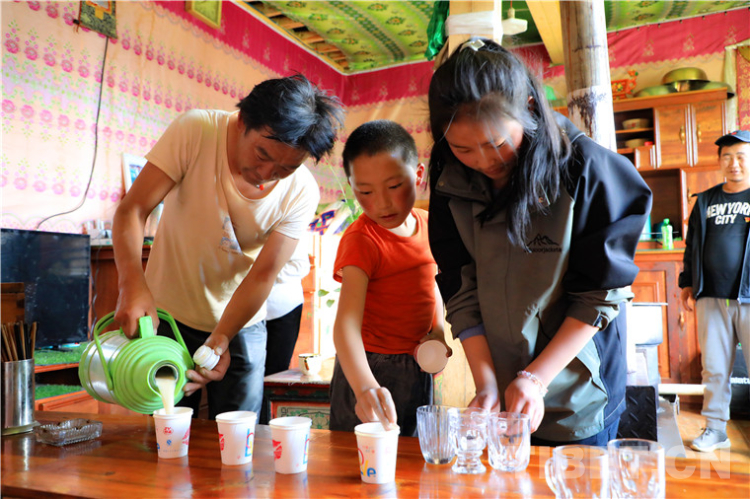 在另一戶村民家里,我們見到了德吉拉姆姐弟倆。姐弟倆非常有禮貌又主動熱情地為我們準備酥油茶、讓座、指路,顯然是父母的“得力小助手”。他們做起事來一板一眼、舉止落落大方,給我們留下很深刻的印象。
