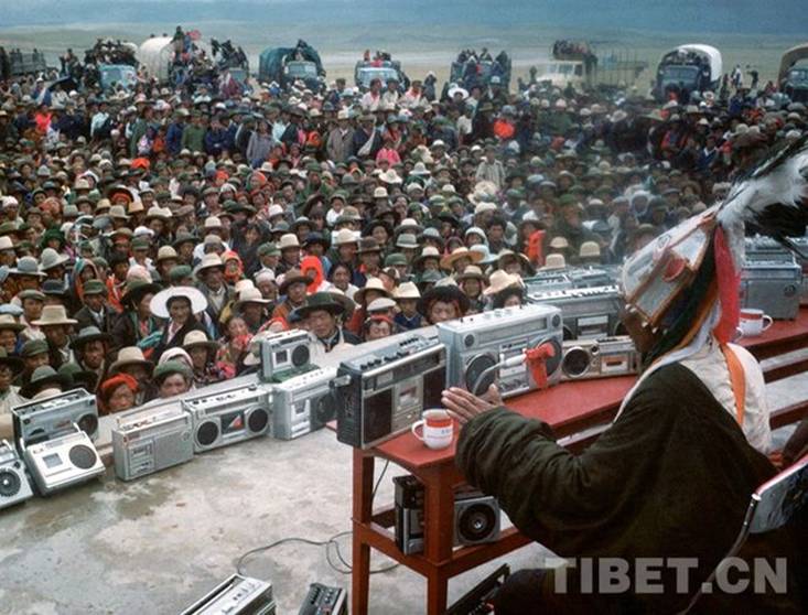 圖為說唱藝人阿達在西藏那曲賽馬會上說唱《格薩爾》的傳奇故事,臺上擺滿了牧民群眾的各式錄音機(才龍1985年前后攝)