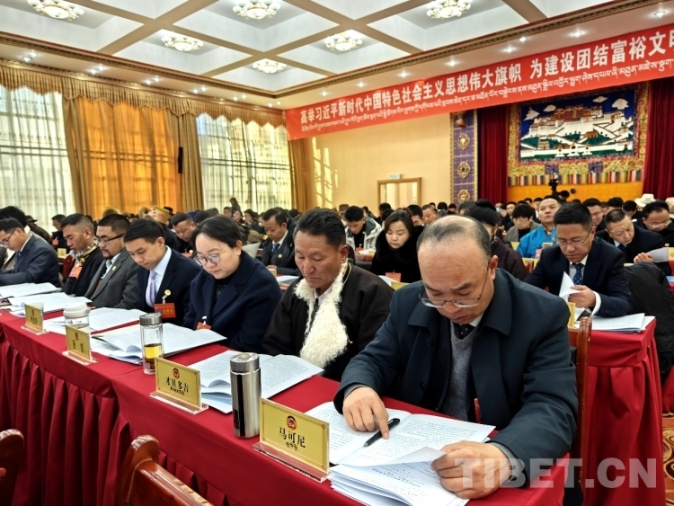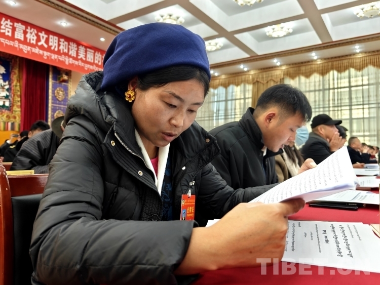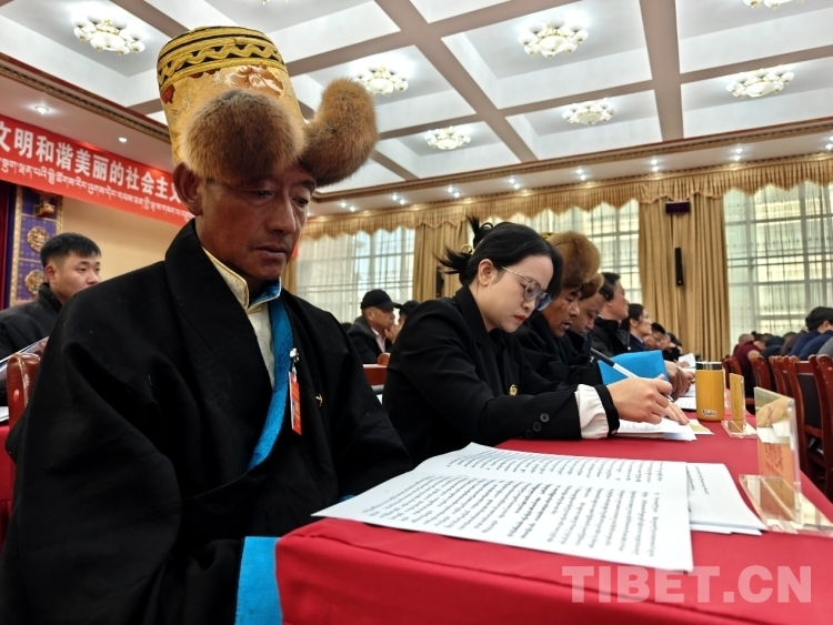 圖為政協(xié)委員認(rèn)真審閱會議資料 攝影:次旦拉姆
