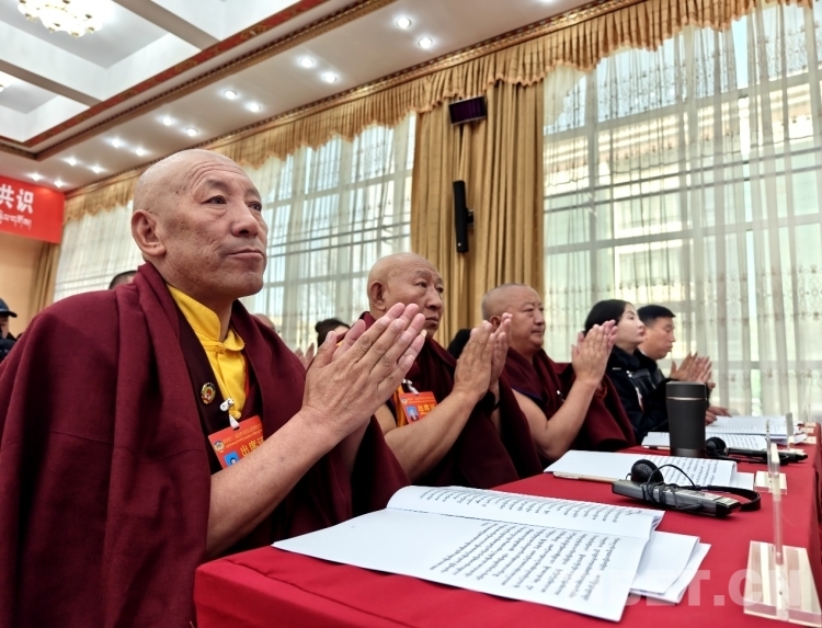圖為政協(xié)委員在認(rèn)真審閱藏文版會議資料 攝影:次旦拉姆