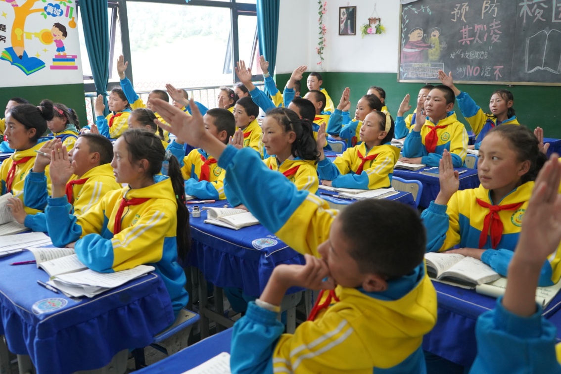圖為西昌鄉(xiāng)小學(xué)學(xué)生在課堂上舉手回答問題 攝影:吳建穎