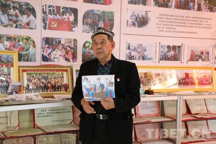 在講述故事的時候,沙勒克江·依明老人總是把腰背挺得直直的,雙眼的目光有神而堅定,說話吐詞帶有重音和落地實感。當(dāng)他拿起照片,講起自己觀看天安門廣場的升旗儀式時,他會用腳一聲一聲地踏出聲音,沉浸描述當(dāng)時國旗班的腳步聲帶給他的心靈震撼。而隨著他的動作,我們的身心也顫抖了起來。