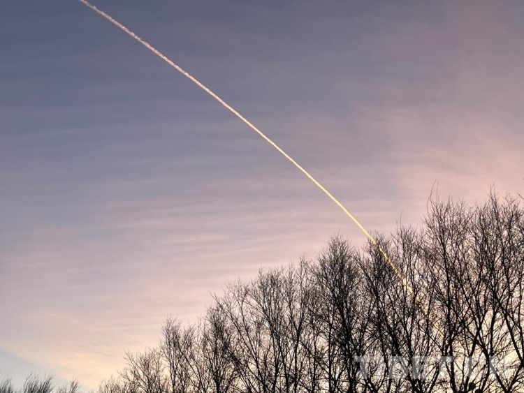 圖為飛機越過粉藍(lán)間接的日出天空 攝影:王妍丹