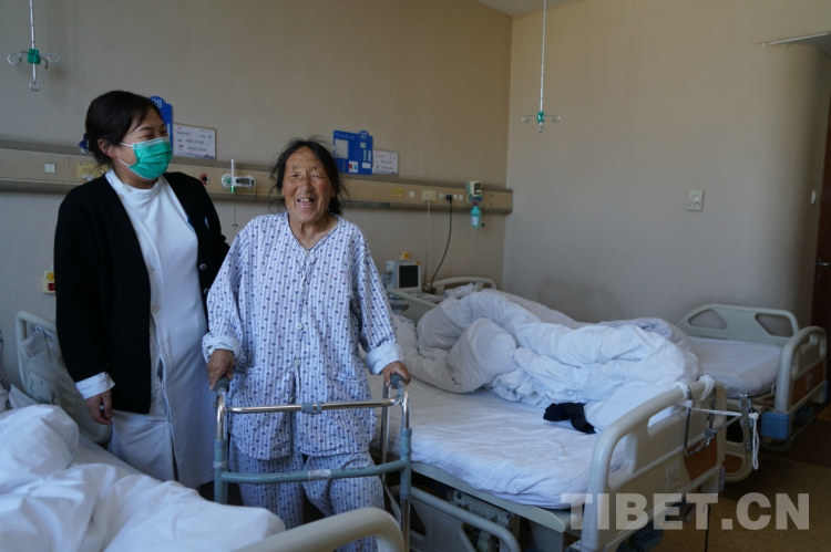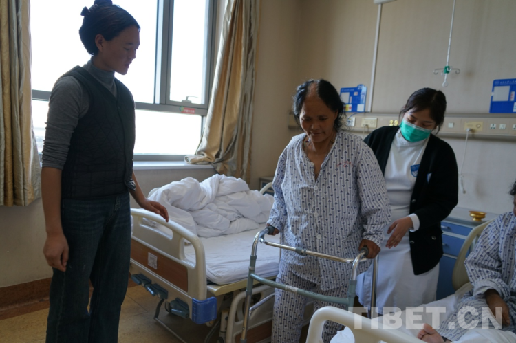 “卓瑪,你快給媽媽翻譯一下,用扶手架轉(zhuǎn)身的時(shí)候90度慢慢轉(zhuǎn),不要一次性轉(zhuǎn)180度,容易摔倒。”骨關(guān)節(jié)科護(hù)士薛小英從剛剛的驚慌中回過神來,對(duì)著29床病人布姆的女兒大聲叮囑道。就在剛才,這個(gè)來自洛隆縣59歲的右膝大骨節(jié)病患者布姆在骨關(guān)節(jié)手術(shù)24小時(shí)后,借助扶手架,在護(hù)士的指導(dǎo)下已經(jīng)能夠下床走路了。只是初次使用扶手架還不太熟悉,剛才180度的大轉(zhuǎn)彎讓一旁陪護(hù)的護(hù)士不禁捏了一把汗。女兒卓瑪聽到護(hù)士的話后趕忙告訴媽媽走路轉(zhuǎn)身要慢點(diǎn),小心別摔倒。