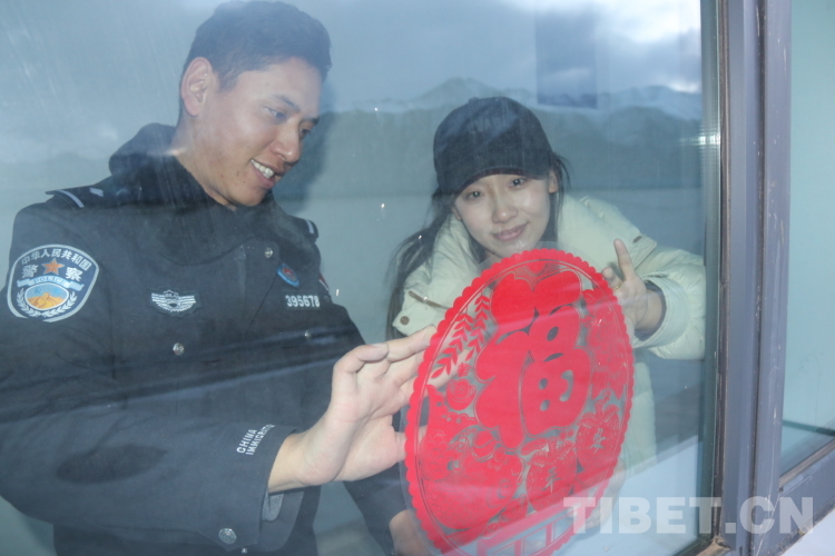 圖為洛追與永措一起裝點(diǎn)營區(qū),貼窗花 攝影:鄭鵬飛