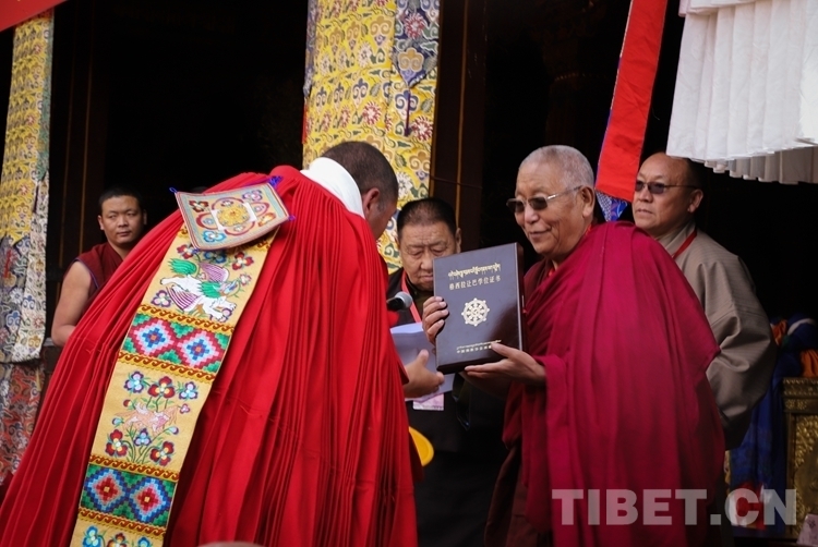 圖為佛協(xié)西藏分會(huì)副會(huì)長、扎什倫布寺堪布噶欽?多吉堅(jiān)贊向獲得學(xué)位的考僧獻(xiàn)哈達(dá)并頒發(fā)學(xué)位證書 攝影:賈華加