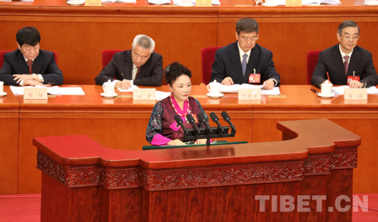圖為全國(guó)政協(xié)委員卓嘎在作大會(huì)發(fā)言 攝影:桑吉