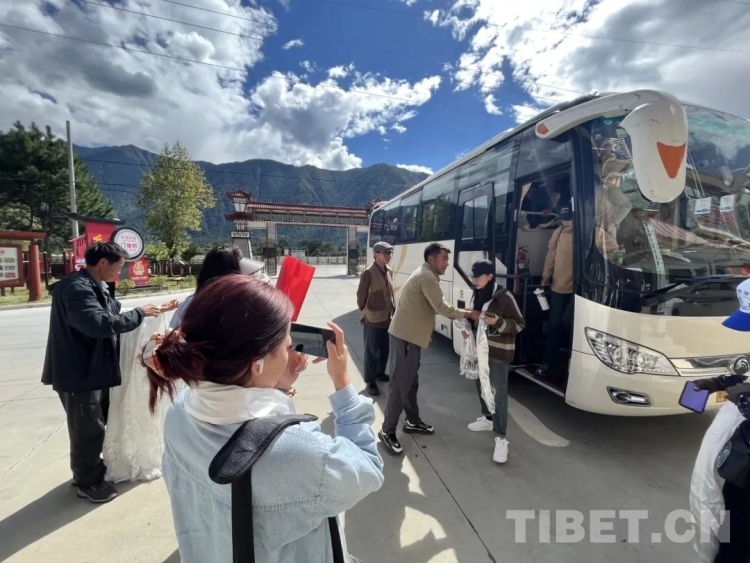 圖為門(mén)仲村工作人員為游客獻(xiàn)哈達(dá)表示歡迎