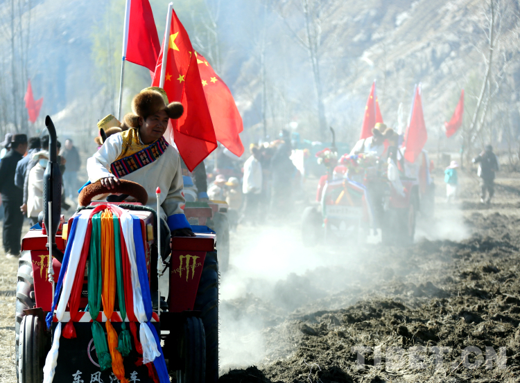 整個(gè)活動(dòng)充滿儀式感。村民們先是來到田地中央燃桑香、獻(xiàn)貢品,祈求風(fēng)調(diào)雨順、無災(zāi)無害、莊稼豐收。開耕第一犁在吉祥喜慶的藏戲《扎西雪巴》表演中拉開了序幕,一輛輛插著五星紅旗,用五彩哈達(dá)、花朵、吉祥圖案裝扮一新的拖拉機(jī)一字排開,涌向待墾的農(nóng)田進(jìn)行翻耕,播撒第一粒種子。
