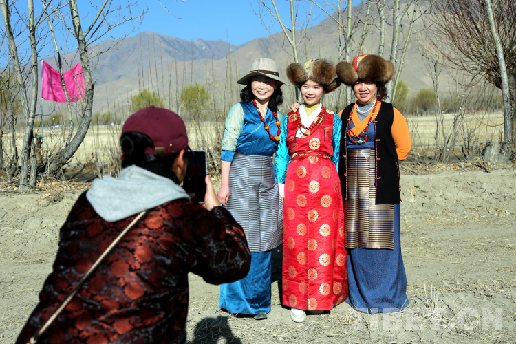 開耕儀式結(jié)束后,茶巴朗村藏戲隊(duì)成員們?yōu)樵缫褤Q好藏裝過來體驗(yàn)西藏民俗文化的游客們獻(xiàn)哈達(dá)、敬青稞酒、唱敬酒歌,游客們現(xiàn)場學(xué)起“三口一杯”與當(dāng)?shù)厝斯捕冗@美好的一天。西藏卓美旅行社負(fù)責(zé)人孫赫男介紹說:“西藏除了山水美景之外,春耕儀式也是非常具有當(dāng)?shù)靥厣奈幕?,能給人留下深刻記憶。今天,我?guī)е鴣碜员鄙蠌V等全國各地的游客來這里體驗(yàn)春耕儀式,讓大家看看西藏當(dāng)?shù)氐娜罕娛窃鯓娱_始春天的。游客們穿著藏裝,免費(fèi)品嘗青稞酒、酥油茶、牛肉、藏雞蛋等各種農(nóng)產(chǎn)品,還和充滿熱情的當(dāng)?shù)卮迕駛兓?dòng),他們玩得非常開心。”