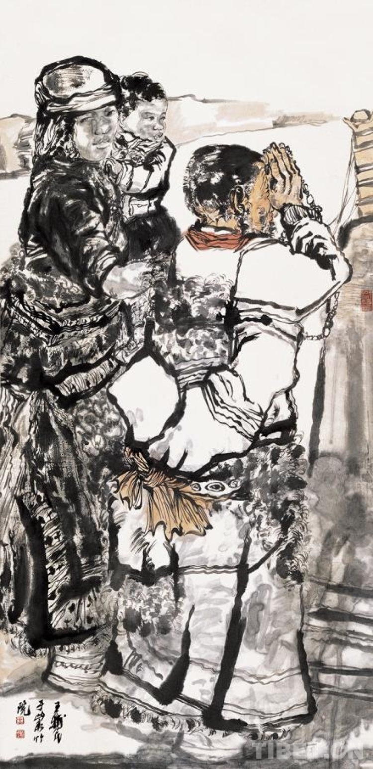 自1978年考入西北師范大學(xué)學(xué)習(xí)中國(guó)畫專業(yè),王輔民對(duì)表現(xiàn)藏族題材的中國(guó)畫充滿興趣。在80年代初,受吳山明老師的影響,王輔民首次接觸到用中國(guó)畫水墨形式表現(xiàn)藏族群眾生活的作品,這為他后續(xù)的創(chuàng)作奠定了基礎(chǔ)。1993年調(diào)入蘭州畫院后,他多次到甘肅省甘南州、青海省黃南州和西藏自治區(qū)各地市采風(fēng)寫生,深入體驗(yàn)當(dāng)?shù)厣?,持續(xù)近30年。這些經(jīng)歷加深了他對(duì)西藏文化的了解,也為他找到了藝術(shù)創(chuàng)作的切入點(diǎn)和主題。