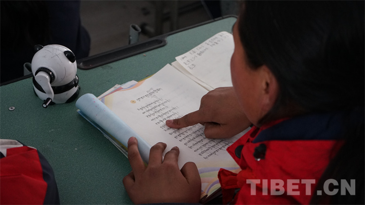 圖為次久卓瑪老師領(lǐng)著學(xué)生讀課文 攝影:張宇