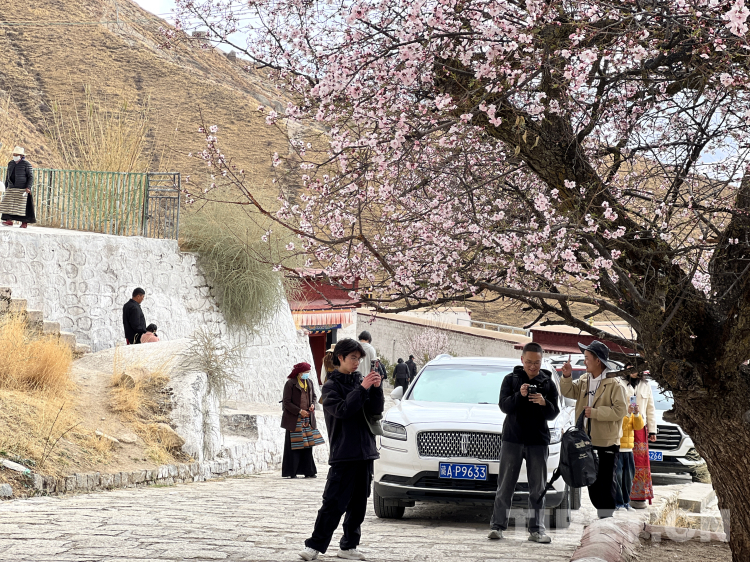 中國西藏網(wǎng)訊 每年4月,位于西藏拉薩主城區(qū)北郊山坡上的古剎帕邦喀(也稱帕崩崗),環(huán)繞寺院周圍的桃花盛開,引來了諸多當?shù)厥忻窕蛴慰图娂娗巴p花、拍照。