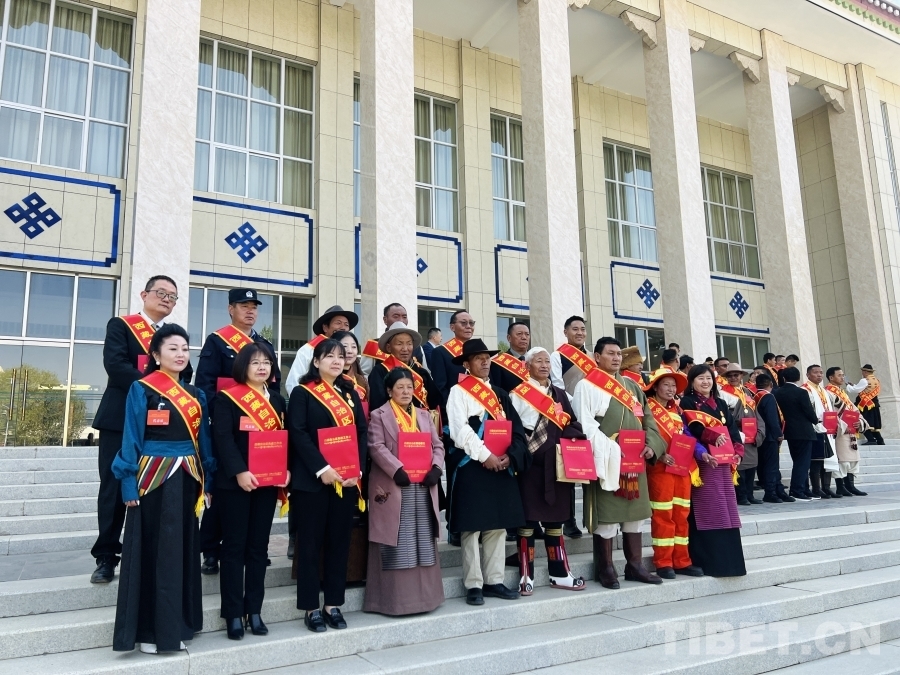 圖為表彰大會結(jié)束后獲獎?wù)邆兒嫌傲裟?nbsp; 攝影:德吉卓瑪
