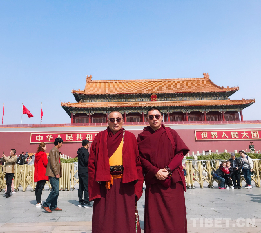 圖為根培活佛(右)在天安門拍照留念