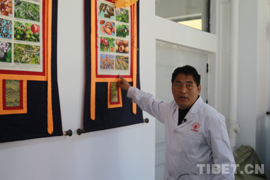 圖為尼偉藏醫(yī)康復(fù)醫(yī)院負(fù)責(zé)人布地介紹畫在唐卡上的生物 攝影:登真巴珍
