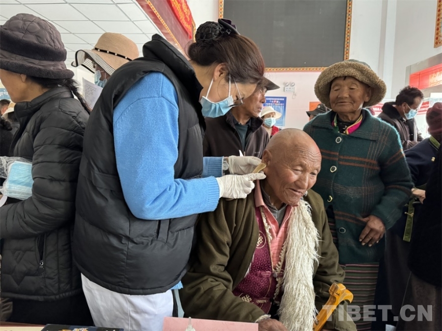 圖為洛隆縣藏醫(yī)院及人民醫(yī)院的醫(yī)療團隊在現(xiàn)場開展平衡火罐、艾灸等中醫(yī)診療服務(wù) 供圖:洛隆縣藏醫(yī)院