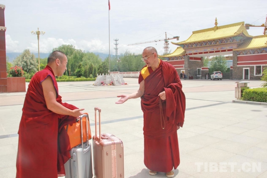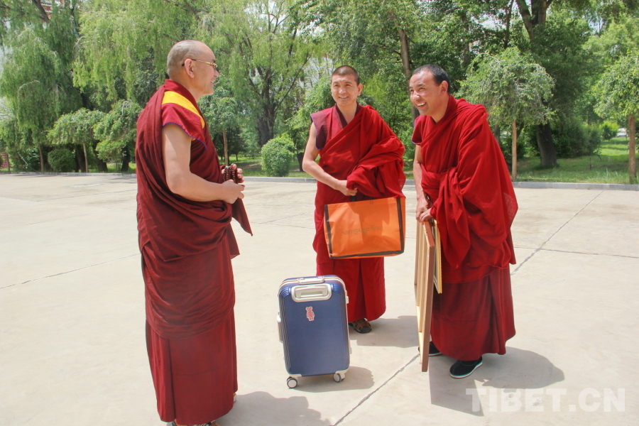圖為青海省藏語(yǔ)系佛學(xué)院教務(wù)處副處長(zhǎng)、特級(jí)經(jīng)師悟嘉倉(cāng)(左一)與準(zhǔn)備離校的畢業(yè)學(xué)僧交談 攝影:劉莉
