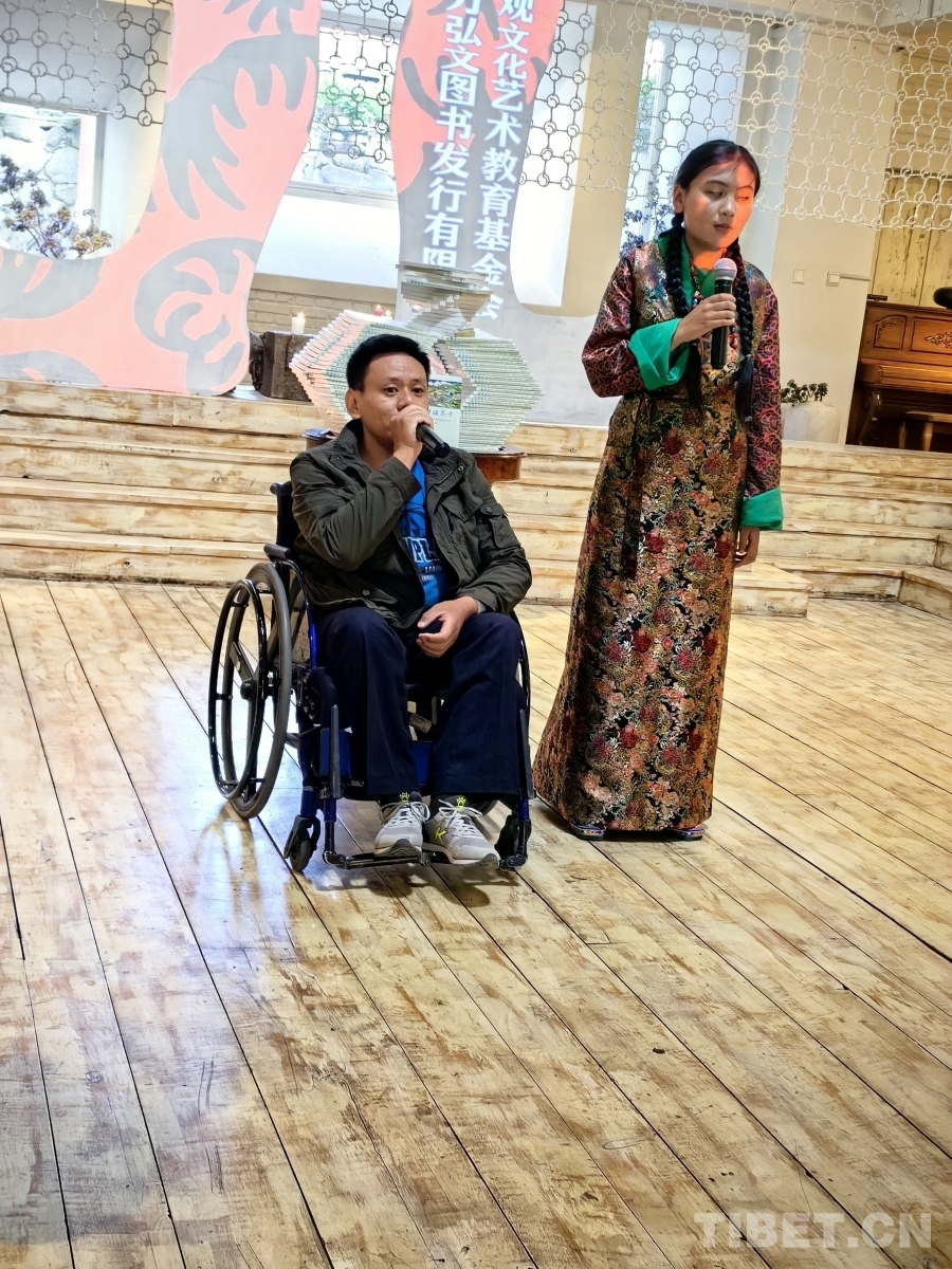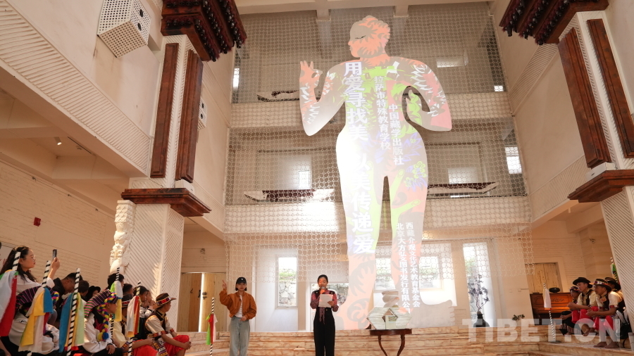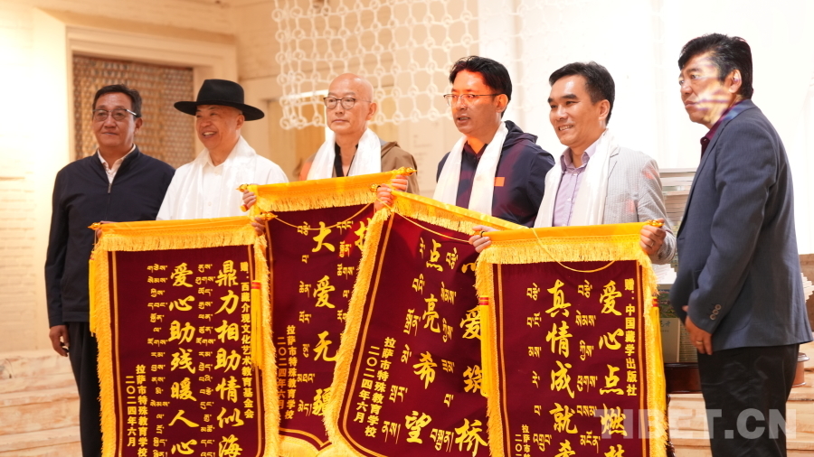 活動現(xiàn)場,拉薩市特殊教育學校師生向西藏社會主義學院羅旦博士、中國藏學出版社代表、北京大方弘文圖書發(fā)行有限公司代表、西藏介觀文化藝術教育基金會代表敬獻了哈達,贈送了錦旗、畫作,對他們在新書出版中給予的支持和幫助表達了誠摯的謝意。隨后,拉薩市特殊教育學校學生為現(xiàn)場來賓表演了二重唱《愛在陽光下》、詩歌朗誦《光明》、舞蹈《舞動大地》等精彩的節(jié)目,將活動推向高潮,現(xiàn)場觀眾紛紛鼓掌叫好,氣氛十分感人。