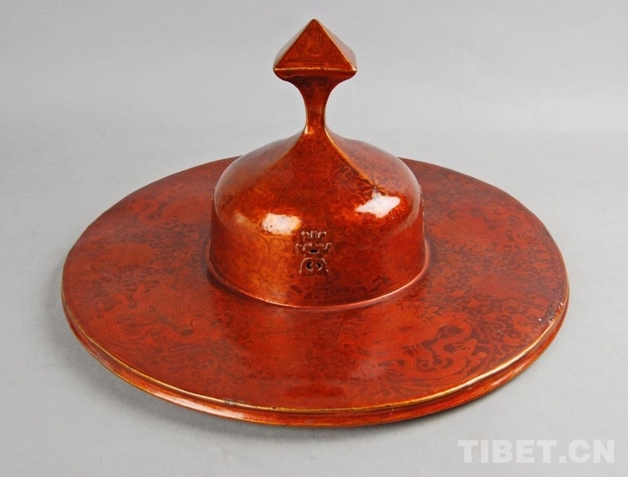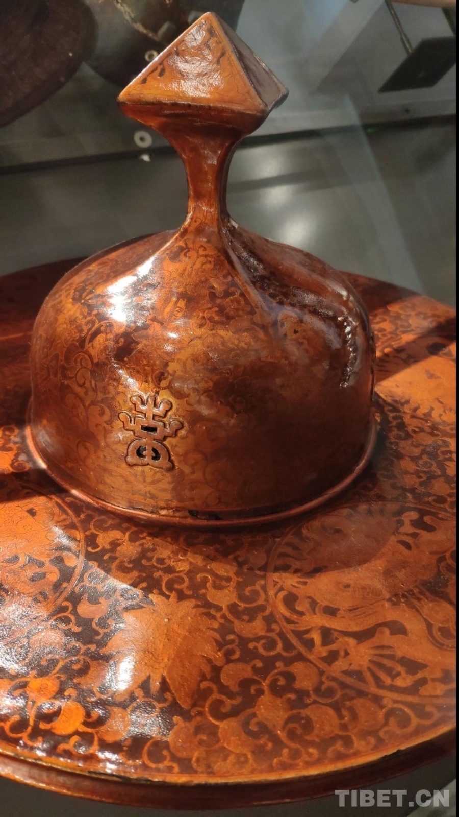 14號(hào)藏品為僧官帽,出自西藏,進(jìn)入館藏時(shí)間為1905年。據(jù)博物館介紹,這頂漆帽原屬于寺院一位僧官所穿服飾的一部分。過(guò)去,西藏地方政府實(shí)行“政教合一制度”,寺院作為一個(gè)地方的宗教事務(wù)和寺院自身的管理者和統(tǒng)治者,同時(shí)又是這個(gè)地方社會(huì)的主要管理者和統(tǒng)治者。因此,遍布西藏各地的寺院往往都是當(dāng)?shù)氐恼?、?jīng)濟(jì)、文化中心,具備政治、經(jīng)濟(jì)、教育、司法等職能。寺院內(nèi)部設(shè)立不同級(jí)別或不同分管領(lǐng)域的僧官來(lái)共同管理整個(gè)寺院的內(nèi)外政教事務(wù)。