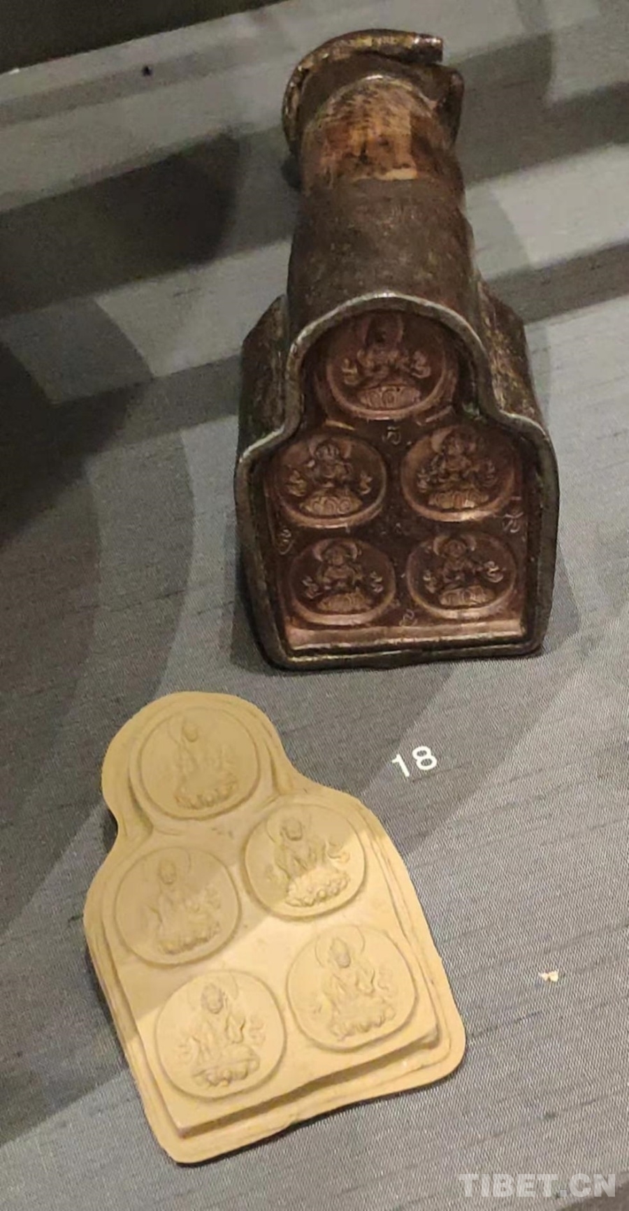 “擦擦”模具,出自西藏,模具為鐵質(zhì),手柄為木質(zhì),一模五腔,進(jìn)入館藏時(shí)間為1905年?!安敛痢币糇g自梵語(yǔ),意思是“復(fù)制”,指一種模制的泥佛或泥塔。藏傳佛教認(rèn)為,制作“擦擦”可積攢善業(yè)功德,并將其視為消災(zāi)祈福的圣物?!安敛痢北黄毡楣┓钣谏裆健⑸竦?、寺廟旁,大路中央或交叉路口。還有的“擦擦”存放于大佛像的體內(nèi)、佛塔中央。除以上的供奉方式外,“擦擦”還常被安放于隨身佩帶的“嘎烏”之內(nèi),充當(dāng)護(hù)身符。