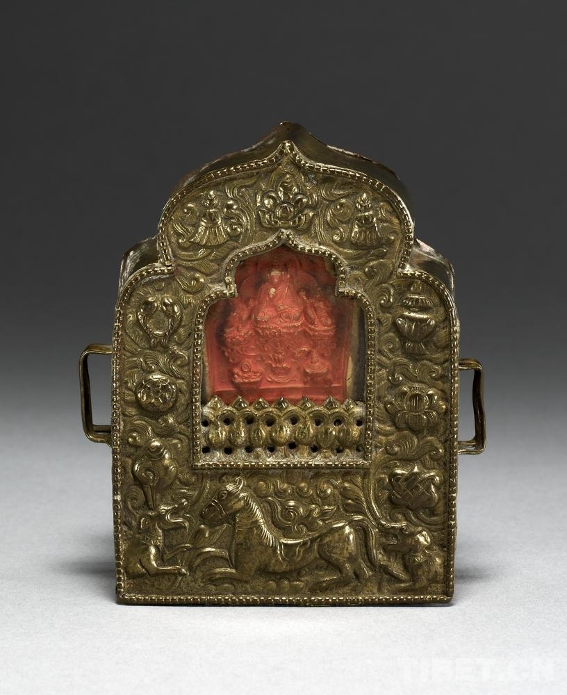 19號(hào)藏品為銅制“嘎烏”,內(nèi)裝有“擦擦”和香料包,出自西藏,進(jìn)入館藏時(shí)間為1905年。“嘎烏”,是藏語(yǔ)的音譯,指護(hù)身佛的盒子,即小型佛龕。盒子里一般裝有“擦擦”佛像、印著經(jīng)文的綢片、舍利子或者甘露丸、由高僧念過(guò)經(jīng)的藥丸,以及活佛的頭發(fā)、衣服的碎片等。“嘎烏”還是精美的裝飾品。其形狀不一,一般為銀質(zhì)或銅質(zhì),盒面上鑲嵌有瑪瑙、綠松石,雕刻有多種花紋圖案。