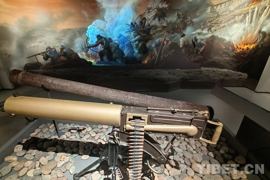 圖為宗山號(hào)角——紀(jì)念西藏江孜抗英保衛(wèi)戰(zhàn)120周年主題展現(xiàn)場(chǎng),英軍當(dāng)時(shí)使用的馬克沁機(jī)槍模型(前),藏軍使用的土炮(后),背景為相關(guān)歷史場(chǎng)景的視覺(jué)還原。馬克沁機(jī)槍是全自動(dòng)機(jī)槍?zhuān)彩钱?dāng)時(shí)殺傷力較大的武器,理論射速達(dá)600發(fā)/分鐘 攝影:楊月云