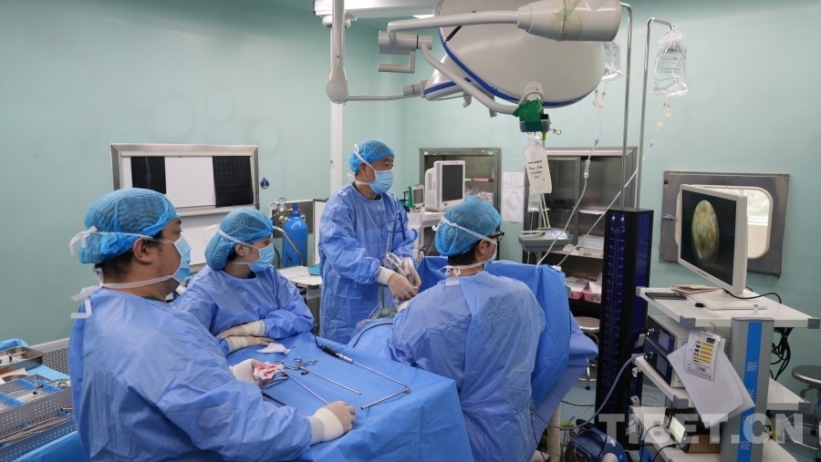 圖為張西峰醫(yī)生(左三)在甘孜藏族自治州人民醫(yī)院為脊柱病變患者做手術 李錄場 攝