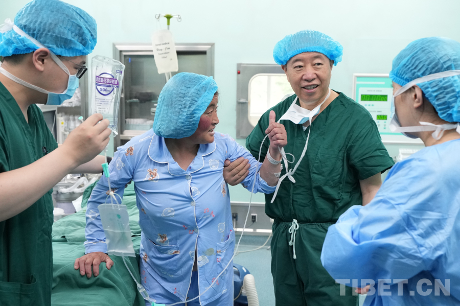 圖為手術室內(nèi),剛剛完成局部麻醉微創(chuàng)椎管擴大減壓手術的藏族患者穆女士在張西峰(左三)的指導下成功站立,并為張教授的精湛醫(yī)術點贊。