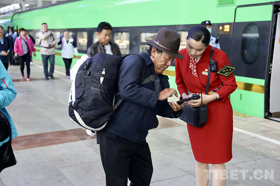 圖為拉日鐵路列車乘務(wù)員為旅客提供幫助 攝影:馬生明