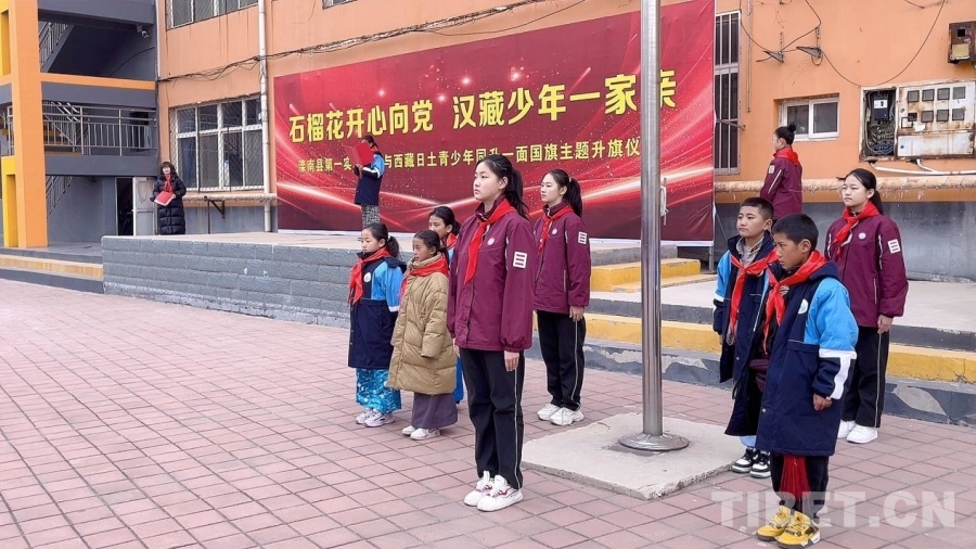 圖為日土縣和灤南縣青少年同升一面國(guó)旗