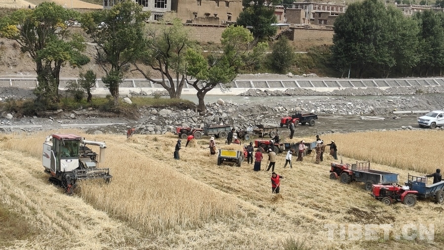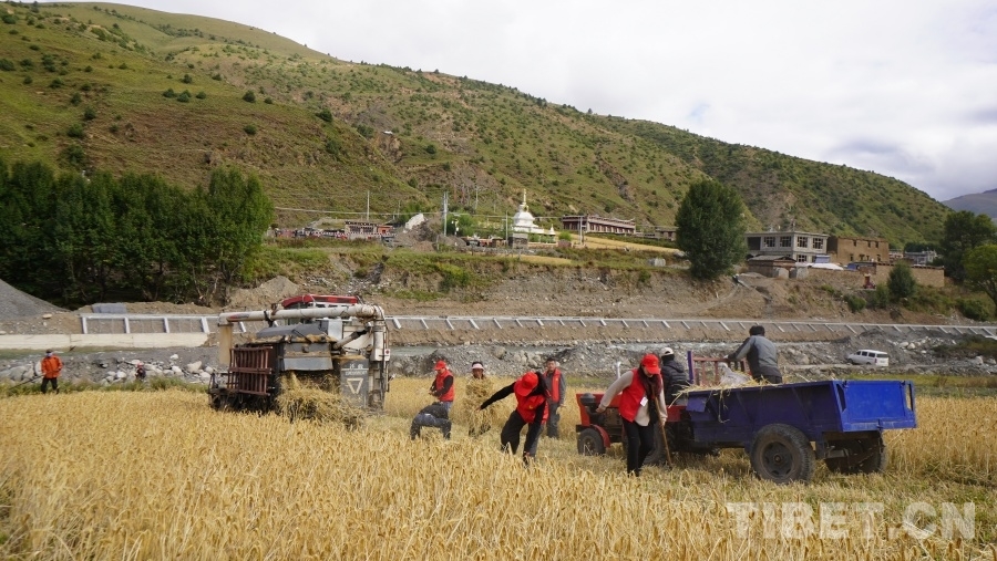 中國西藏網(wǎng)訊 眼下正是地處川西高原的四川省甘孜藏族自治州理塘縣青稞成熟時節(jié),群眾們忙著用收割機收獲青稞,在中秋時節(jié)感受豐收的喜悅。