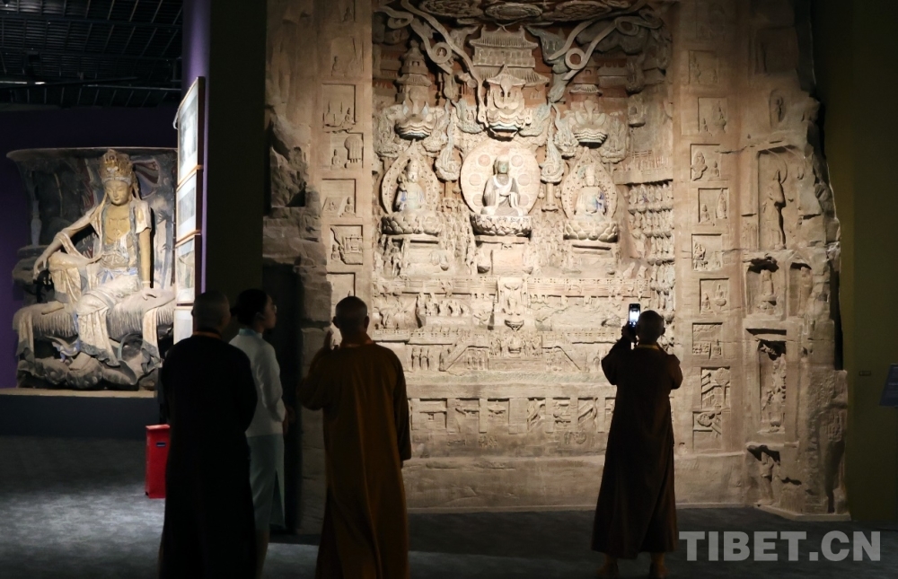 圖為與會(huì)者在“翰墨佛緣——‘中國(guó)歷代繪畫大系’佛教藝術(shù)珍品展”上參觀大足石刻北山佛灣第245龕觀無量壽佛經(jīng)變相龕(3D打印復(fù)制)