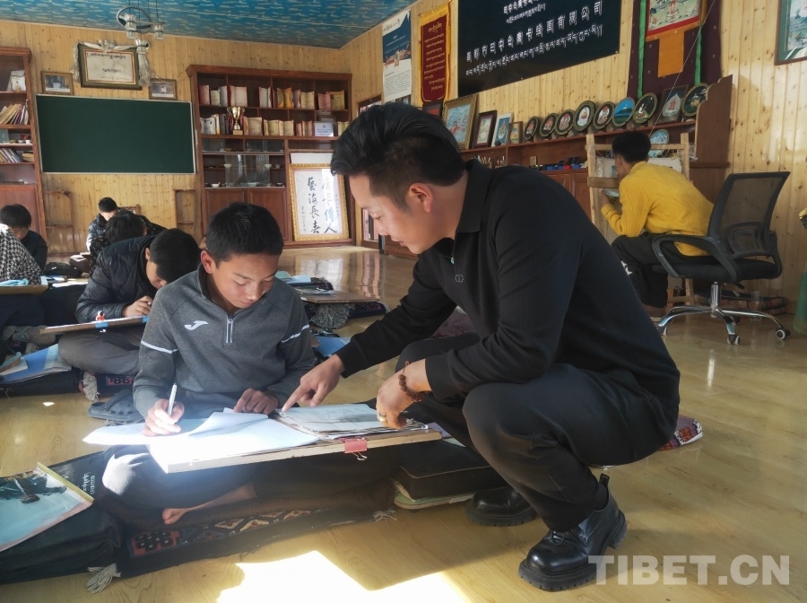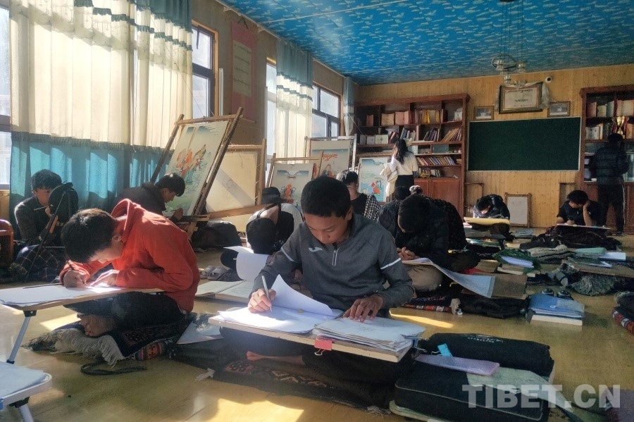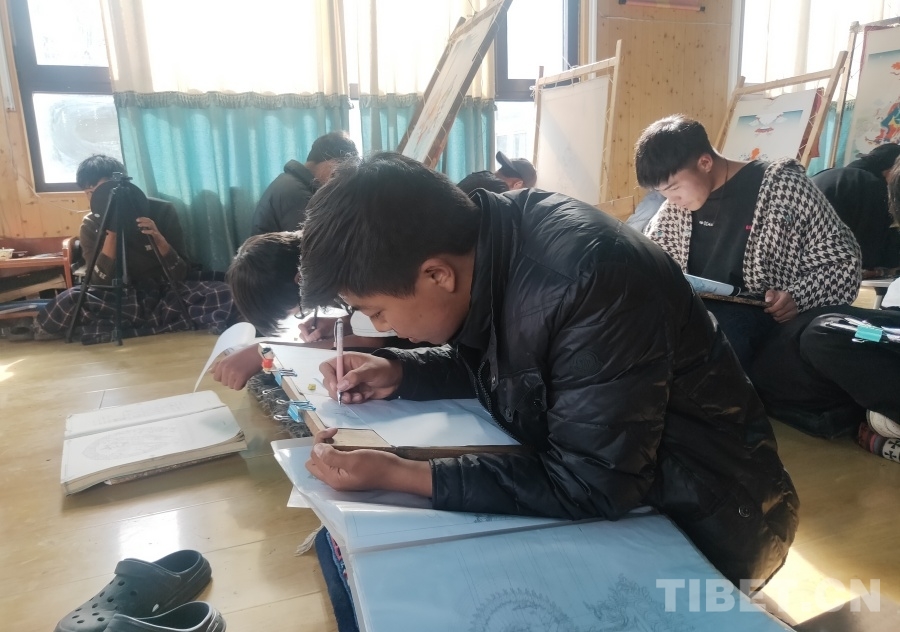 圖為更嘎東周在練習唐卡白描 攝影:周晴晴