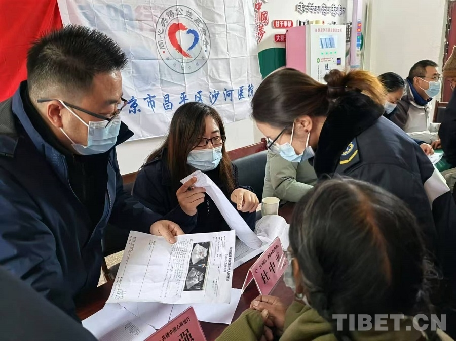 圖為北京市昌平區(qū)沙河醫(yī)院黨委書記李瑞強,航空總醫(yī)院路金玲主任,北京復興醫(yī)院唐煜主任為當?shù)匕傩账腿ノ繂栁镔Y 攝影:張曉雪