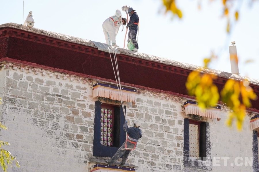 圖為專業(yè)工人正在為布達(dá)拉宮外墻噴涂涂料 攝影:邊子捷