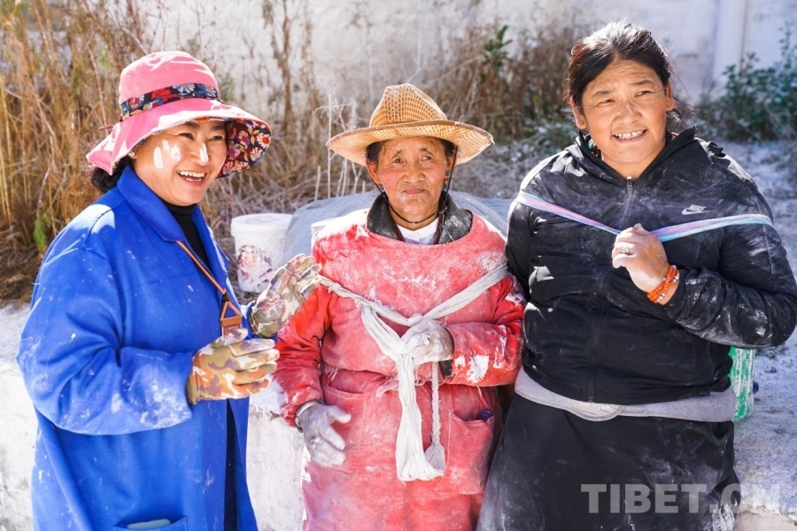 “布達(dá)拉宮外墻的白色涂料主體是來(lái)源于拉薩市當(dāng)雄縣羊八井和日喀則市仁布縣一帶的高嶺土,也就是我們通常所說(shuō)的白灰。為了保證涂料的黏性和光澤度,在白灰兌上水后,我們會(huì)加入牛奶、白糖、牛骨膠、植物膠等配料。這些配比都是由長(zhǎng)期從事布達(dá)拉宮文物保護(hù)的工匠來(lái)操作的,每種原材料的比例都是經(jīng)過(guò)匠人們長(zhǎng)期的經(jīng)驗(yàn)積累所總結(jié)出的最佳配比方案。我們經(jīng)常會(huì)遇到群眾在幫忙的過(guò)程中在配比好的涂料中加入自己隨身攜帶來(lái)的牛奶等物,我們能夠理解群眾善良質(zhì)樸的心情,但其實(shí)改變了涂料配比后原有的黏度、光澤度都會(huì)改變,是不利于文物保護(hù)的?!边叞铜傔_(dá)說(shuō)布達(dá)拉宮管理處每年都會(huì)在粉刷季向群眾和游客科普文物保護(hù)知識(shí),希望群眾和游客在參與粉刷之時(shí)能夠遵守秩序,共同保護(hù)好這一文化遺產(chǎn)。