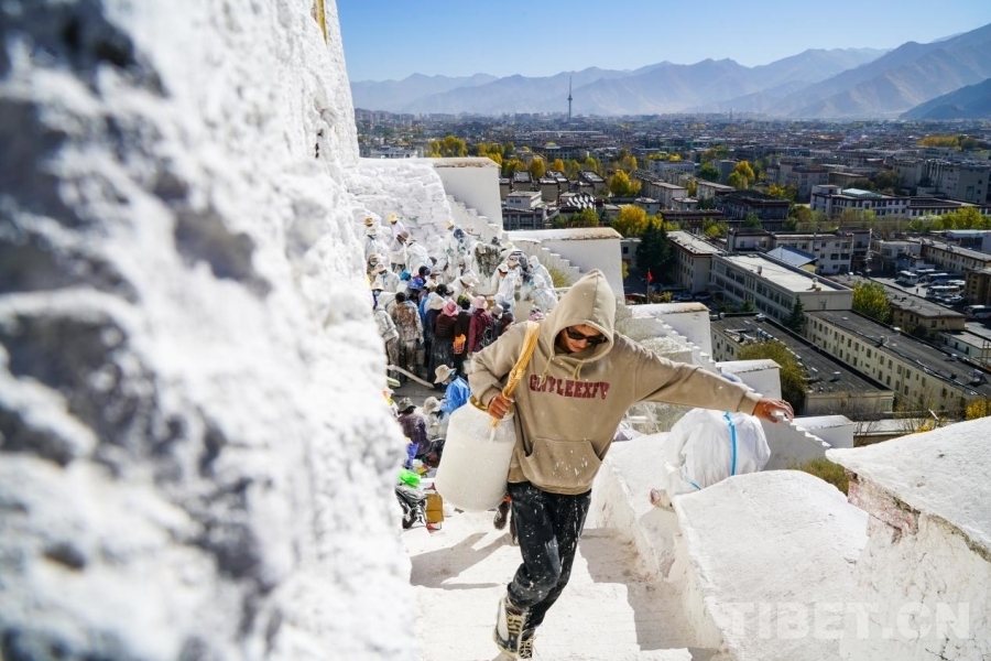 布達(dá)拉宮外墻粉刷一般持續(xù)7-10天,要在藏歷的9月22日之前全部完成。此刻,拉薩的雨季剛剛結(jié)束,冬季的寒冷結(jié)冰尚未到來(lái),每年大家都趕在入冬之前完成這一浩大的粉刷工程。