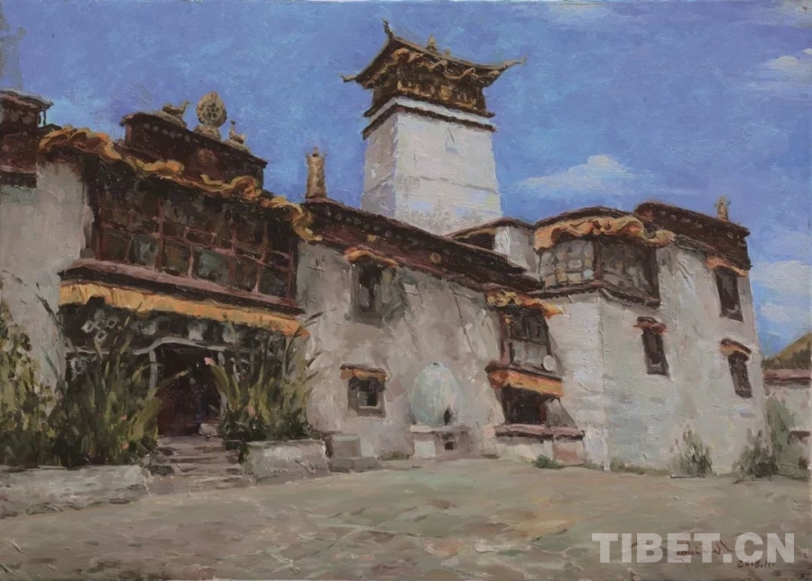 圖為“藍(lán)天白云——雪域高原油畫(huà)作品巡展”作品《桑嘎古多》(50x70cm 布面油畫(huà))作者:扎西次仁