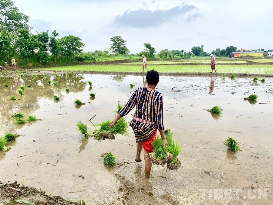 圖為尼泊爾農(nóng)民正在水田中耕種