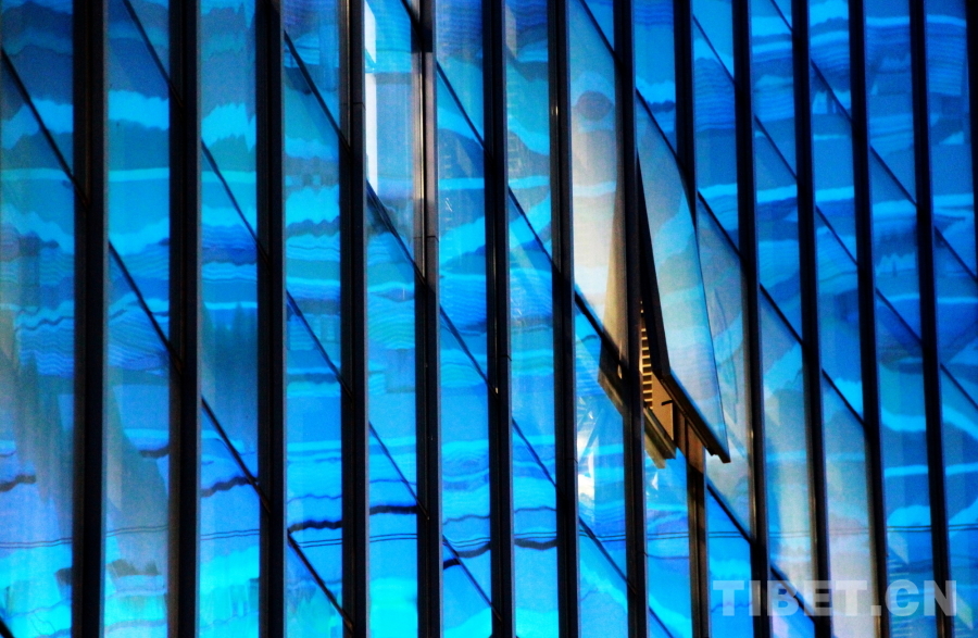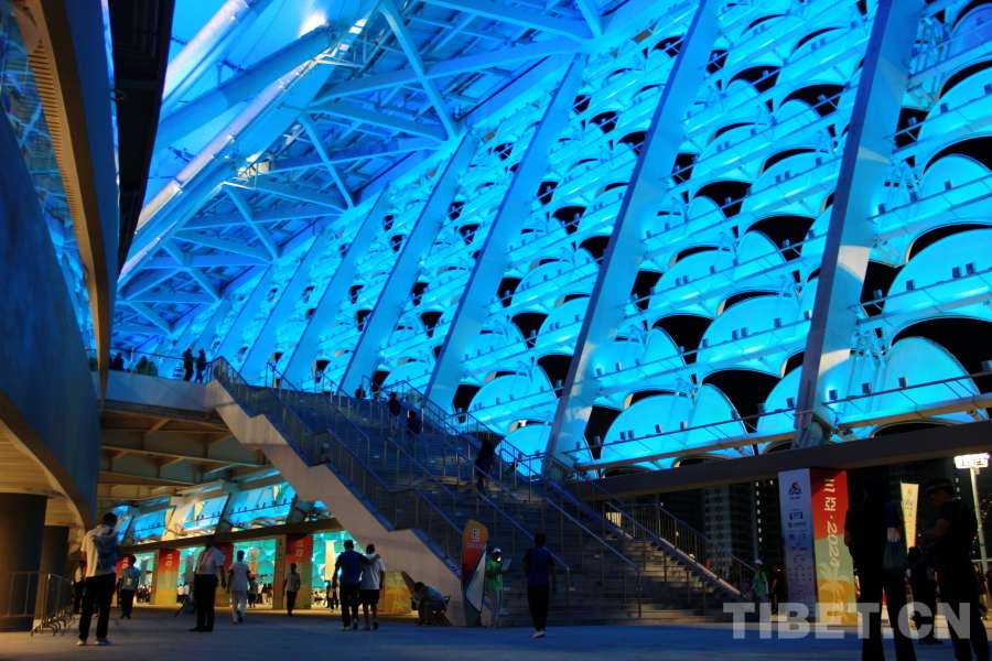 圖為三亞市體育中心體育場(chǎng)內(nèi)部的玻璃結(jié)構(gòu)反射的藍(lán)色燈光 攝影:劉莉