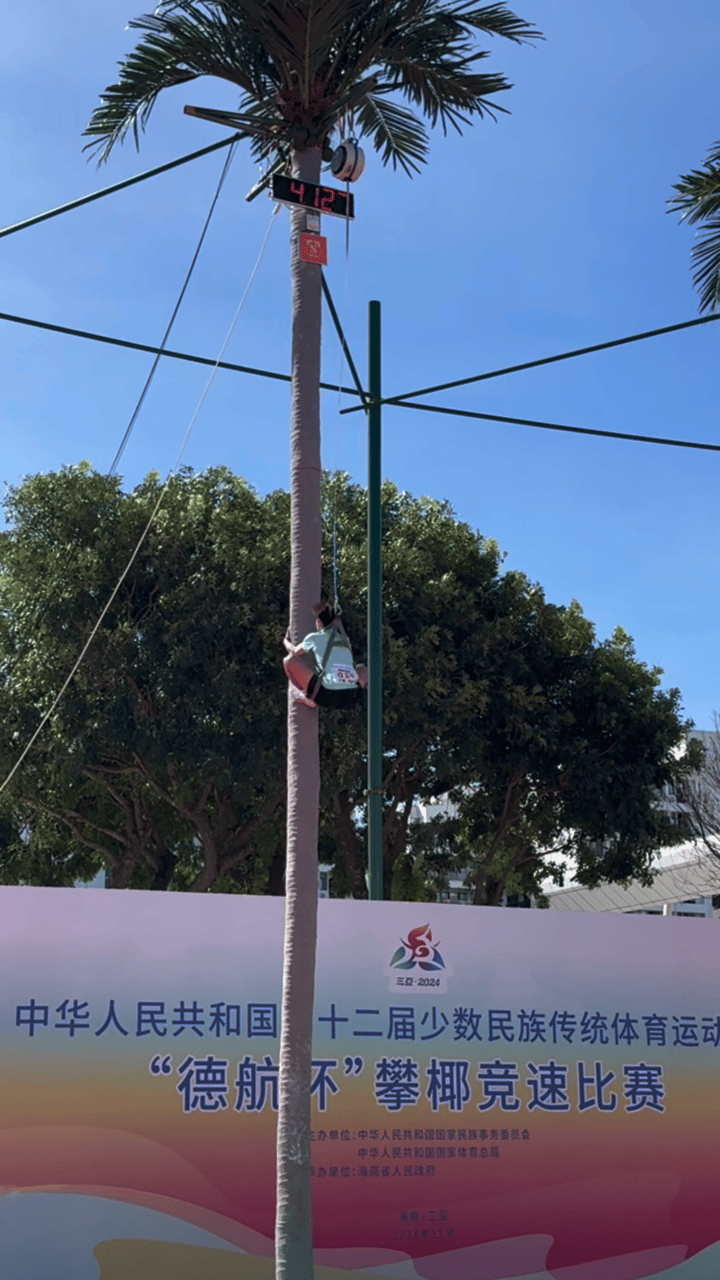 攀椰競速設立男子攀椰9米競速和女子攀椰7米競速兩個項目,比賽要求運動員使用統(tǒng)一提供的攀椰運動用具,徒手攀爬至椰樹頂部并按下計時器,用時短者獲勝。