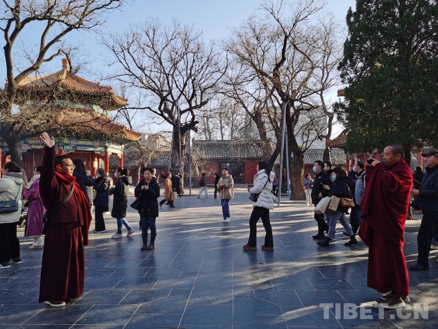 據(jù)雍和宮管理處工作人員孫尚喬介紹,雍和宮初建于康熙三十三年(1694年),雍正三年(1725年)改建為行宮,乾隆九年(1744年)又改建為藏傳佛教格魯派寺廟。寺內(nèi)前部的七座建筑:昭泰門、鐘樓、鼓樓、雍和門、雍和宮、講經(jīng)殿、密宗殿,呈現(xiàn)中國佛教寺院“七堂伽藍”式標準布局。講經(jīng)殿、密宗殿、時輪殿和藥師殿“四大扎倉”的設立,標志著雍和宮是座藏傳佛教的完整學府。漫步于這座曾經(jīng)的皇家廟宇,西藏佛學院師生們充分了解到雍和宮沉淀豐厚的歷史文化,特別是為何宮改廟以及廟內(nèi)文物的具體情況等。