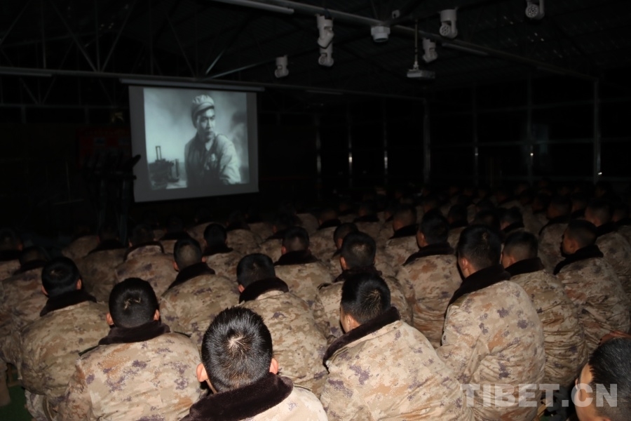 圖為軍營戰(zhàn)士共看紅色電影