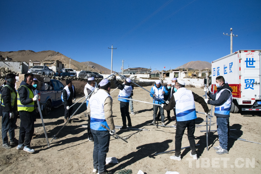 圖為在左措村地震安置點(diǎn)現(xiàn)場(chǎng),山南市乃東區(qū)甘肅青海企業(yè)家商會(huì)愛心人士正在搭建物資發(fā)放帳篷 攝影:趙振宇