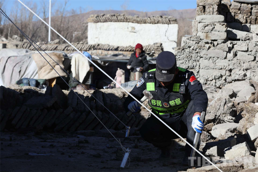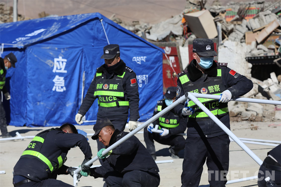 圖為西藏移民管理警察在定日縣長所鄉(xiāng)雜村為受災群眾安裝帳篷 攝影:郭遠敬